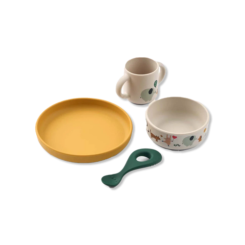 Deze populaire LIEWOOD eetset bestaat uit een beker, kom, bord en lepel - perfect voor baby's en kleine kinderen. Gemaakt van duurzaam en onbreekbaar siliconen, ideaal voor dagelijks gebruik.